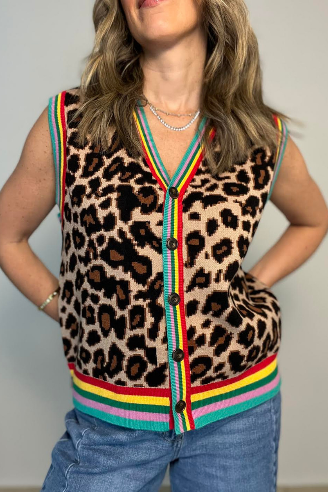 Sleeveless button down leopard sweater vest with rainbow color contrast accent.
